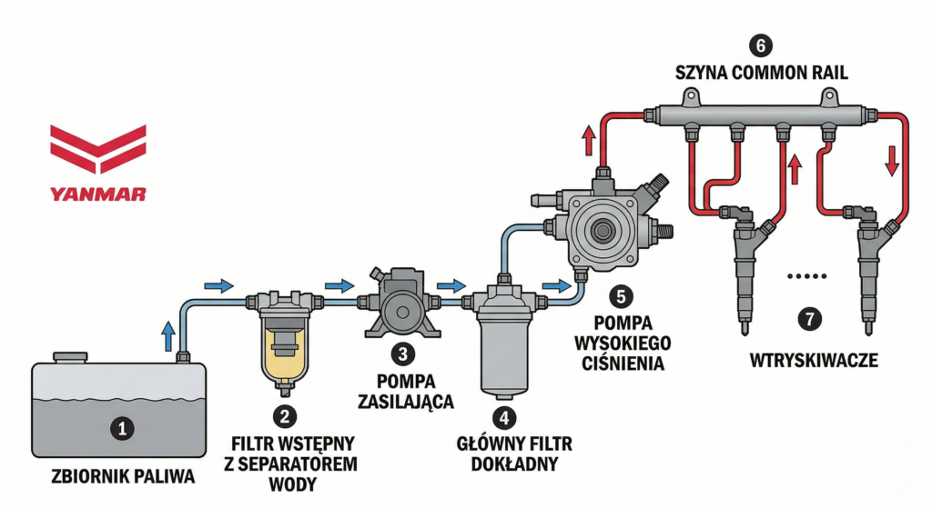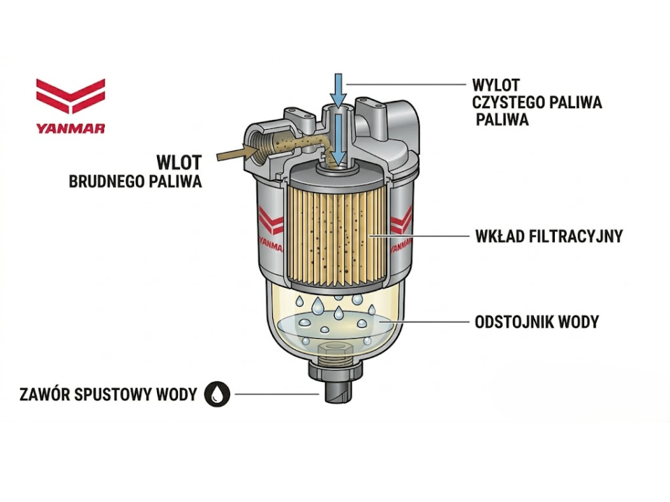 Filtr nie jest tylko „dodatkiem” – to kluczowy element eksploatacyjny. Sprawny separator wody i filtr paliwa o odpowiedniej przepuszczalności (zgodnej ze specyfikacją Yanmar) potrafią zatrzymać 99% zanieczyszczeń.