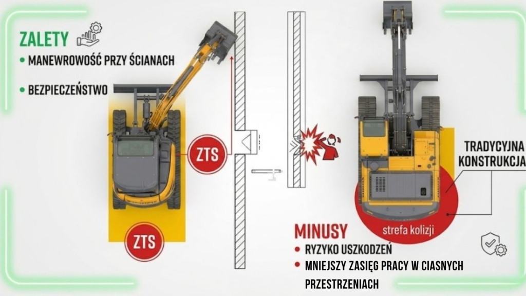 Wybór między koparką z tradycyjną przeciwwagą a maszyną typu Zero Tail Swing (ZTS) to jedna z najważniejszych decyzji przy doposażaniu floty. Choć na pierwszy rzut oka różnią się tylko obrysem, w praktyce determinują one styl i bezpieczeństwo pracy.