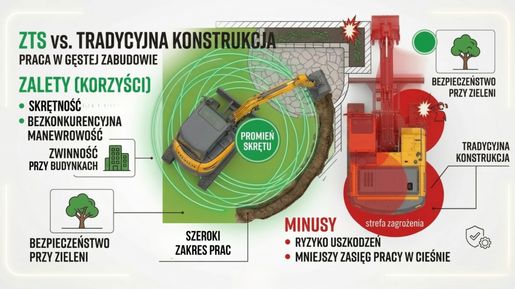 W miejskich wykopach lub na terenach prywatnych posesji liczy się każdy centymetr. Koparka ZTS pozwala operatorowi skupić się wyłącznie na tym, co dzieje się przed nim (łyżka), zamiast ciągle zerkać w lusterka, czy tył maszyny w coś nie uderzy. To ogromny komfort psychiczny i większa szybkość pracy.