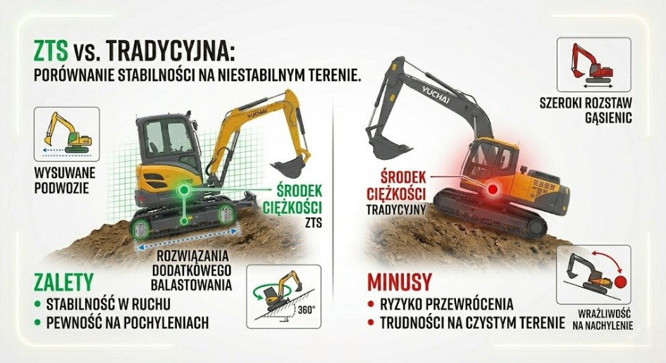 ZTS: Aby zrekompensować brak „ogona”, producenci tacy jak Yuchai stosują szersze podwozia lub dodatkowe obciążniki nisko osadzone w maszynie. Nowoczesne modele ZTS niemal dorównują stabilnością klasycznym konstrukcjom, zachowując przy tym kompaktowość.